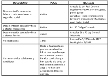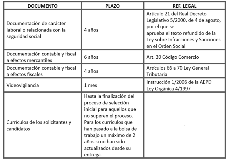 A título informativo, a continuación, se recogen los datos legales de conservación de la información con relación a diferentes materias: